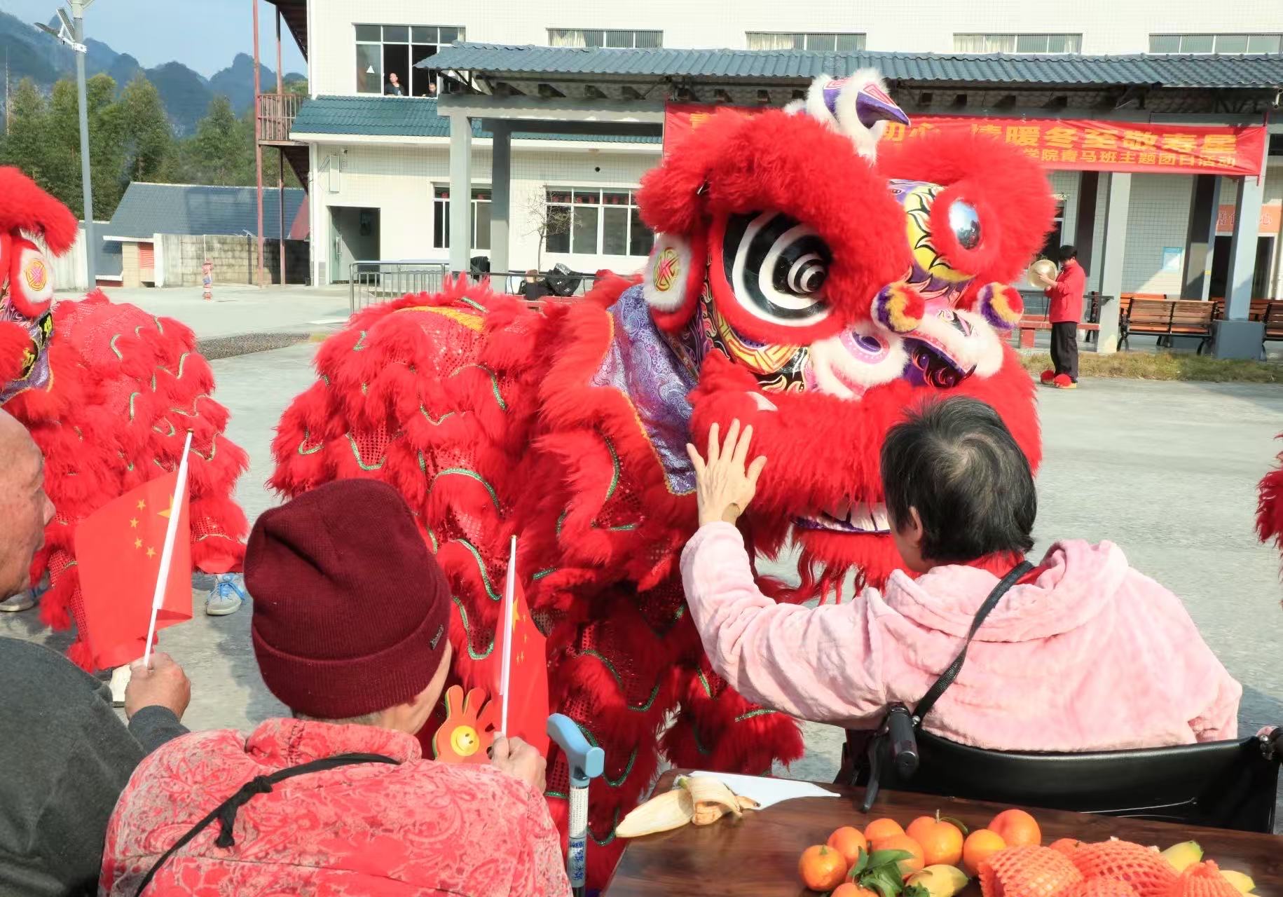 活动在欢腾的龙狮表演中拉开帷幕。学校龙狮艺术团带来《龙狮飞舞》表演,腾跃的狮身、灵动的龙影,拉满冬至喜庆氛围。表演结束后,老人们亲手触摸狮头,沉浸式感受传统文化魅力,非遗文化也在敬老爱老的温情里,完成了一次生动的传承。