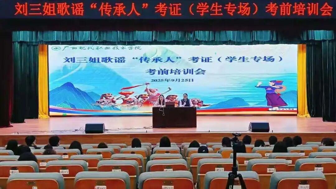 我校地处“刘三姐”文化孕育之地,“山歌进校园”是校园文化“一校一品”特色项目。作为2006年列入国家级非遗的广西民间文化瑰宝,“刘三姐”歌谣承载民族记忆与智慧,以生动歌词、婉转旋律广为流传。为传承这一非遗,2025年9月29日,我校“刘三姐”歌谣传承人等级考核(学生专场)在综合楼A201、B201教室顺利开展。